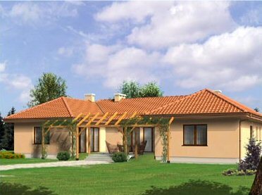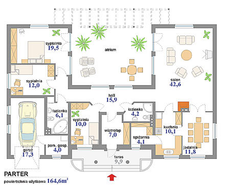 jednorodzinny dom parterowy z otwartym atrium i garażem, niepodpiwniczony