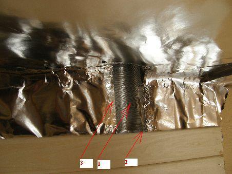 Jeden z najważniejszych elementów - to wentylacja. Jest ona instalowana od strony zewnętrznej sauny. Niekoniecznie na górze; nawet jest lepiej, jeśli zostanie zainstalowana wewnątrz przeciwnej ściany. Jednak w naszym przypadku opuszczenie wylotu wentylacyjnego znacznie ogranicza wąskość wnęki między ścianą a boazerią. Do wnęki wkłada się aluminiową, giętką rurę, robi się drewnianą ramkę i przestrzeń wypełnia się pianką montażową. Rurę odcina się równo ze dołem boazerii i łączy się z folią.