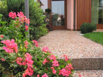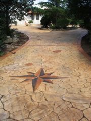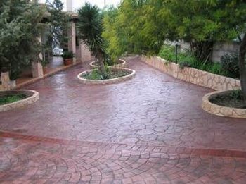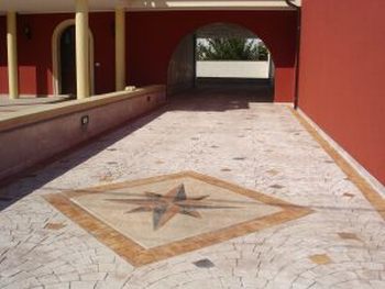 „Stamped Concrete" charakteryzuje się stabilną strukturą, powstającą dzięki specjalnej warstwie betonu, która chroni powierzchnię od zmian atmosferycznych. Ta technologia daje możliwość nadać brukowi pożądany kolor oraz teksturę kamienia, cegły, łupka, płytki i nawet drewna. Zalany beton pokrywa się specjalnym kolorowym usztywniaczem.
