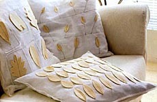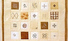 Kiedyś prawie każda kobieta umiała szyć i wyszywać. Dzisiaj ten typ robótek ręcznych stał się prerogatywą artystów. Wyroby, wykonane techniką „patchwork" rzeczywiście są dziełem sztuki. Są to różnokolorowe kwadraty na jasnej bawełnianej tkaninie dodatkowo upiększone własnoręcznie wykonanym, kontrastowym wzorem. Naturalną gamę kolorystyczną podkreślają akcenty o delikatnym tonie ochry. Czterocentymetrowe obszycie z niebarwionego lnu - to niczym obramowanie wykończające kompozycję.