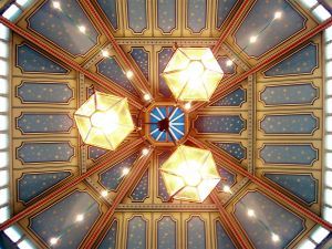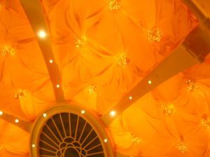 Blado - błękitny albo jasno - czerwony sufit imituje niebo i wschód słońca.