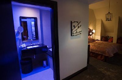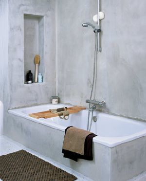 Oryginalnie będą wyglądać też nierówne ściany łazienki pokryte wodoodporną farbą.