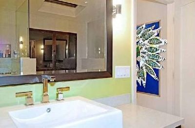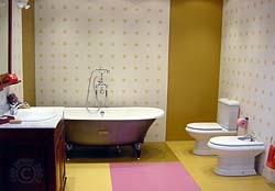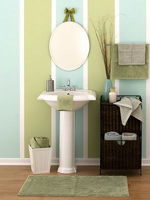 Szerokie kolorowe pasy nawet nieciekawie wykończonej łazience nadają świeżości i rześkości. Najpierw ścianę maluje się na biało, później na niej rysuje się jedno albo wielokolorowe pasy.