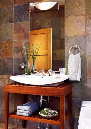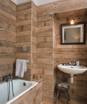 Inny sposób wykończenia ścian łazienki - to drewno. Zwolennikom drewnianych powierzchni radzimy deski impregnować, pokryć mieszanką antyseptyczną i kilkoma warstwami lakieru matowego chroniącego od pleśni.