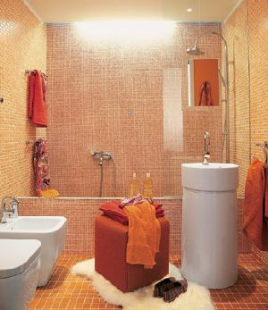W łazience idealnie pasuje jasny pomarańczowy kolor. Psycholodzy twierdzą, że pomaga on zachować zdrowie o każdej porze roku. Wyrazistość ścian nie musi jednak drażnić oko, dlatego kolor można „rozrzedzić", np. kolorem białym. Przy takim rozwiązaniu ładnie będą się komponować akcesoria z przezroczystego plastiku.