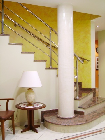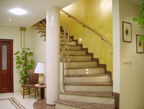 Dobrym posunięciem było wykonanie kolumny ze stiuku (tynku) weneckiego. Odcień stiuku dobraliśmy o dwa tony jaśniejszy niż kolor kamiennych podstopni. Dzięki temu kolumna nie zdominowała wnętrza.
