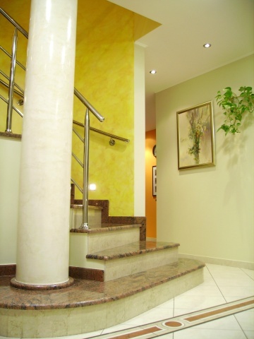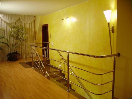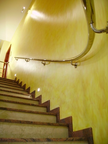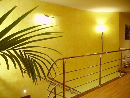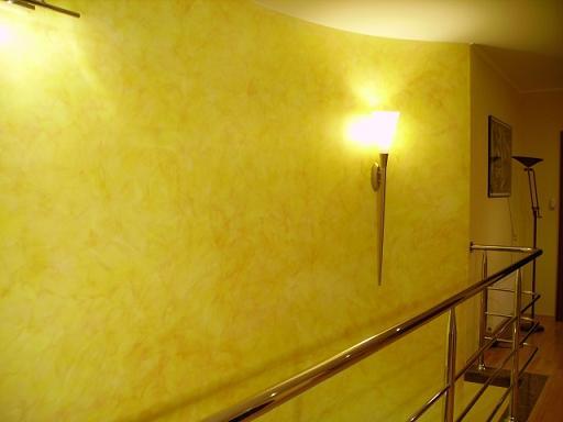 Chcąc zachować styl i klasę pomieszczeń zdecydowaliśmy się na ciepły piaskowy kolor, oczywiście nie mogło też zabraknąć bardziej zdecydowanego akcentu czyli miedziano-żółto-perłowej przecierki na ścianie klatki schodowej.