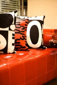 Z niespodziewanym elementem mogą komponować się również naczynia w kolorze akcentu (w tym przypadku - poduszeczki)