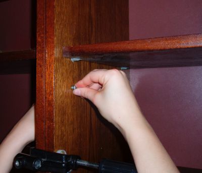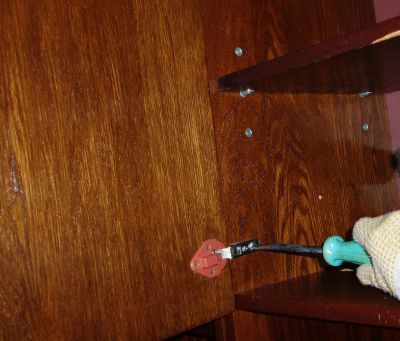 Teraz, gdy części meblościanki są odpowiednio połączone i nieprzekrzywione, zdejmijcie zacisk. Obejrzyjcie dwie ściśle złączone ścianki meblościanki, przykręćcie z powrotem drzwiczki. Meblościanka wyrównana.