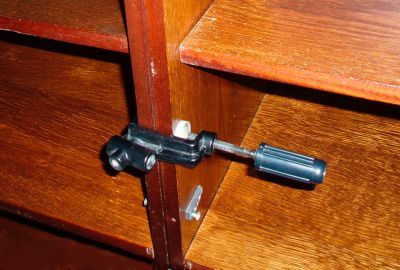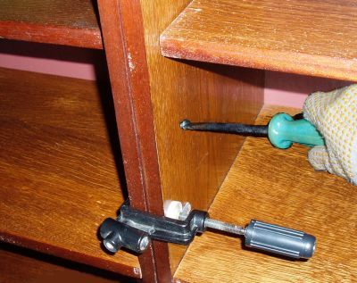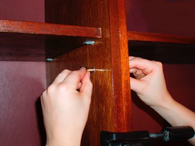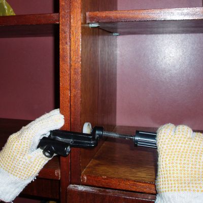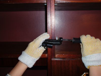Na początku pracy odkręćcie drzwiczki szafy bądź meblościanki, w taki sposób uzyskacie łatwy dostęp do wymagających złączenia ścianek meblościanki, między którymi powstała poprzeczna szpara – przekrzywienie. Wzmocnijcie te dwie znajdujące się obok siebie ścianki za pomocą małego zacisku, żeby ściśle się złączyły. Teraz nie ma między nimi szpary.