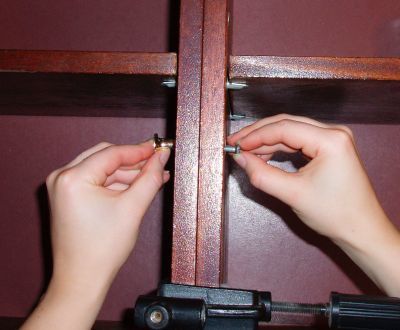 W otwór wstawcie części łącznika. Z jednej strony – gilzę, z drugiej – śrubę. Gilzę trzymajcie nie przekręcając jej, ruszać się musi tylko śruba wkręcana do gilzy. Ważne, by trafić śrubą w jej gwint, dlatego pierwsze obroty można wykonać ręcznie. Później trzeba korzystać z śrubokrętu, a najlepiej z dwóch: jednym śrubokrętem przytrzymajcie w miejscu gilzę żeby się nie obracała w miejscu, a drugim mocno do oporu wkręćcie śrubę. Jeśli nie wystarczy jeden łącznik, użyjcie kilku, po wywierceniu otworów.
