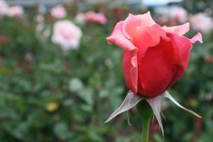 Przycinanie. Cel przycinania - każdego roku usunąć stare porosty i stymulować rozwój zdrowych, młodych porostów. Przycinanie jest korzystne dla róż tym, że są one odmładniane, obficiej kwitną i są zdrowsze. Trzeba pamiętać: wszystkie uszkodzone, słabe i zmarznięte części muszą zostać docięte do zdrowej tkanki i tylko naostrzonym narzędziem; cięcie musi być skośne, jeśli z pączka wyrasta kilka łodyg, zostawić trzeba tylko jedną, najlepszą, inne usunąć. Główne przycinanie wykonuje się wiosną. Przycina się dwa razy, pierwszym - zaraz po pęknięciu pąków, odcina się martwe gałązki. Nieprzycięte krzaki dezynfekuje się i ziemię na około nich dezynfekuje się różnymi preparatami z zawartością miedzi (1 proc. roztworem bornym, 0,2 proc. fundazolem, 0,5 proc. tlenochlorkiem miedzi, 0,5 proc. siarczanem miedzi), ponieważ w ziemi mogą znajdować się przezimowane szkodniki i zawiązki chorób grzybowych. Drugie wiosenne przycinanie - po większym rozwinięciu się róż. Zostawia się tyle pączków, ile krzak jest w stanie wyżywić. Przycina się na trzy sposoby: „słabym" (obcina się tylko górną część róży, miniaturowe krzaki przycina się tylko w ten sposób), „średnim" (mniej więcej po środku porostu) i „mocnym" (gdy zostawia się krótkie, porosty o długości około 20 cm z 1-3 oczkami). W sezonie róże przycina się przez całe lato (obcina się przekwitnięte kwiaty, wycina się słabe, krzywe i stare, nieproduktywne porosty) i jesienią, do samej zimy.