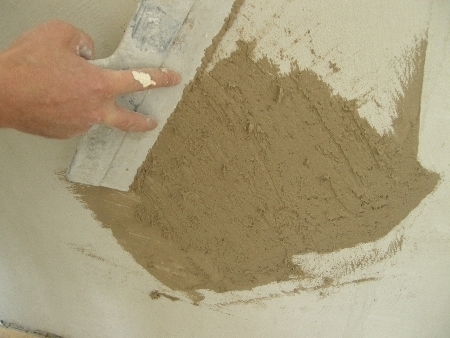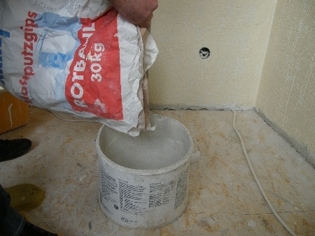 Składniki dokładnie mieszamy z wodą aż przybierze odpowiednią tynkowi konsystencję, nakładamy na dużą szpachlę