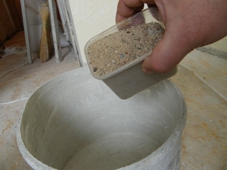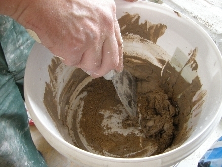 Po kilku eksperymentach dochodzimy do następujących proporcji: wiadro gipsowego tynku, szklanka 5 - frakcji piasku (im większa frakcja piasku i im więcej kamyczków, tym więcej rowków).