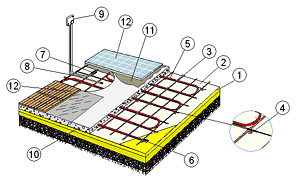Zbrojenie. Jeśli podłoże jest wystarczająco mocne, zbroi się jedną siatką bądź dwoma warstwami armatury. Przeznaczenie siatki - przejąć napięcia w stwardniałym betonie wynikające z osiadania. Do warstwy betonowej o grubości 5-10 cm najlepiej nadaje się metalowa cynkowana 4-5 mm druciana siatka zbrojna, przeznaczona do wzmocnienia konstrukcji stropowej, tym samym do przymocowania przewodu grzejącego.