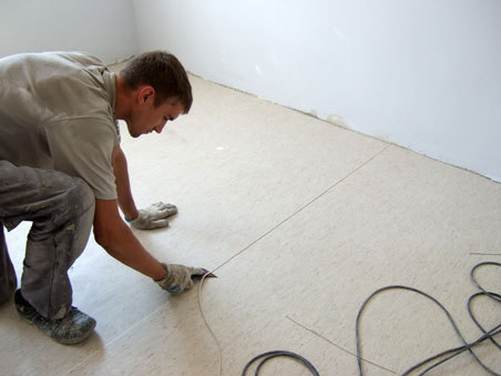 Po wyschnięciu gruntu podłoże pokrywamy klejem, układamy linoleum, przyciskamy, następnie równo obkrajmy krawędzie.