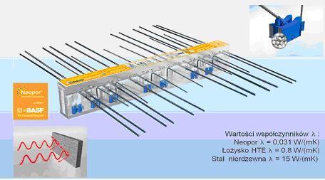 1. Kryterium izolacyjności - łącznik powinien możliwie najskuteczniej izolować. Tutaj niezwykle istotną rolę odgrywają parametry charakteryzujące „izolacyjność" łącznika. O nich decyduje budowa samego łącznika. Obecnie w najnowocześniejszych łącznikach, jako materiał izolujący wykorzystywany jest Neopor firmy BASF posiadający współczynnik przewodzenia ciepła λ = 0,031 W/(m*K) , pręty nośne wykonane są z wysokogatunkowej stali nierdzewnej [fyk=700 N/mm2 ; λ = 15 W/(m*K)], połączone doczołowym zgrzewem z prętami ze stali czarnej [fyk=500 N/mm2 ; λ = 60 W/(m*K)], łożyska oporowe wykonane są z betonu kompozytowego bardzo wysokiej wytrzymałości (B150) z dodatkami zmniejszającymi przewodność cieplną (λ = 0,80 W/(m*K)).