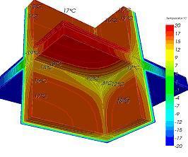 Następuje tu nałożenie się na siebie dwóch mostków: materiałowego i geometrycznego. Skutkuje to jeszcze bardziej zwiększonym wyprowadzaniem ciepła z budynku, a w rezultacie jeszcze niższą temperaturą na powierzchni wewnętrznej - temperatura w narożu osiąga wartość ok. 7,5oC(*). W tym przypadku ryzyko wystąpienia kondensacji pary wodnej na powierzchni wewnętrznej ściany jest bardzo wysokie.