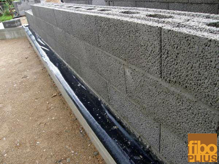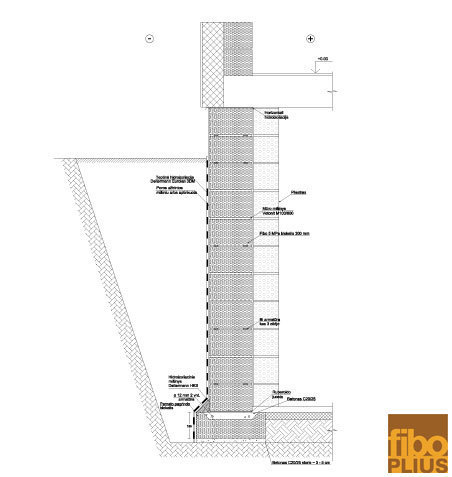Fundamenty z bloczków FIBO wygodnie stawiać wtedy, gdy podczas montowania chcemy obejść się bez dźwigu. Grubość fundamentu wybiera się według szerokości konstrukcji ściany, jednak nie może być mniejsza niż 30 cm. Stawiając fundamenty można komponować bloczki dwóch grubości, np. chcąc postawić fundament o grubości 40 cm, można użyć bloczków 30 + 10 cm. Głębokość fundamentu koniecznie nie może być mniejsza niż 1,2 m. Głębokość fundamentu oblicza projektant na podstawie miejsca stawiania budynku. Po wykopaniu wymaganej głębokości rowu, na grunt kładzie się bloczek podstawy fundamentu i do jego wgłębienia wlewa się beton, uzbraja się prętami Ø 12 mm. Na podstawie stawia się bloczki, które uzbraja się nad pierwszym i co trzecim rzędzie dwoma zbrojeniami Ø 6-8 mm lub taśmami zbrojącymi BI. Ścianki zewnętrzne znajdujących się pod ziemią bloczków muszą być zalane zaprawą. Przed rozpoczęciem murowania ściany na fundamencie musi być położona pozioma hydroizolacja. Rysunek.