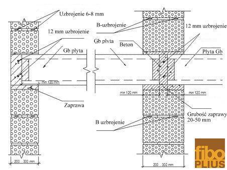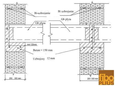 Podparcie płyty żelbetonowej (do 6 m długości). W indywidualnym budownictwie najczęściej używa się standardowych niekrawędziowanych płyt żelbetonowych, krótszych niż 6 m. Rzadko trafiają sie dłuższe. Jeżeli nie są projektowane powiększone bądź koncentrowane obciążenia, standardowe płyty do 6 m długości mogą być podparte prosto na murze z bloczków FIBO, wcześniej układając na nim zaprawę o grubości 2 cm. Brzeg płyty musi zachodzić na ścianę 12-15 cm. Pozostająca na zewnątrz luka wypełniana jest betonem, do którego wkładane mogą być również końce płyty żelbetonowej. Jest to wygodny sposób. Upraszcza przebieg budowy i jest tańszy, w porównaniu z wykonaniem pierścienia żelbetonowego, który jest konieczny opierając stropy na bloczkach o mniejszej wytrzymałości.