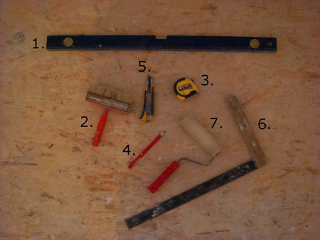 1. Linijka/poziomica. 2. Pędzel do kleju. 3. Miarka. 4. Ołówek. 5. Nożyk do tapet. 6. Kątomierz. 7. Wałek.