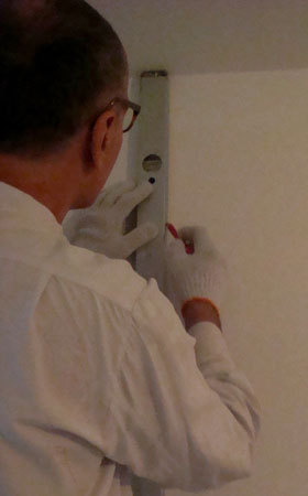 Kreślenie pionowej linii przy pomocy poziomicy od sufitu do podłogi.