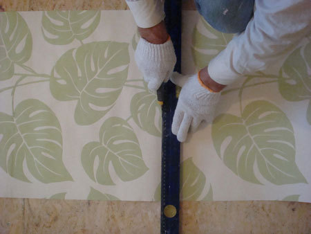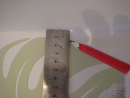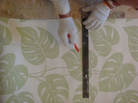 Na pierwszym pasku tapety należy nakreślić linię przycięcia tapety w nieco dalszej odległości, niż wysokość ściany i z tego względu odciąć ciut dłuższy pasek, ponieważ często kąt ściany nie bywa dokładnie prosty i pasek tapety odcięty dokładnie o takiej długości jak ściana może zostawić widoczne odstępy.