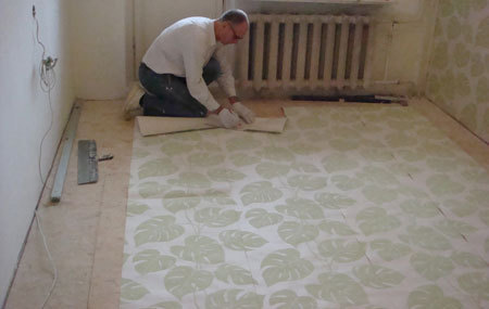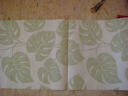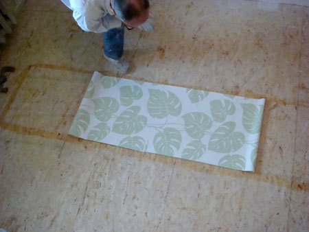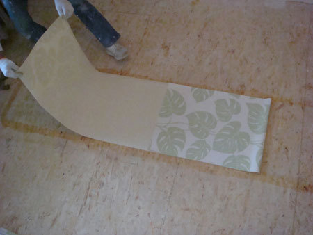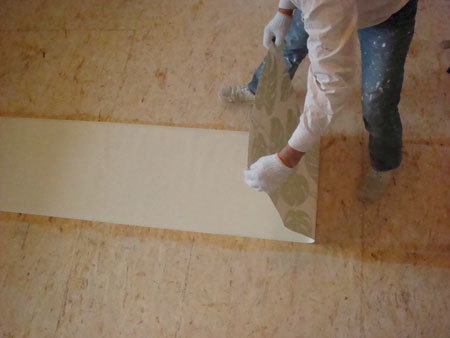 Z tego względu, że tapeta ta ma wzór, który należy dostosować między paskami, przygotować te paski i dopasowywać wzory trzeba na podłodze. Z drugiej strony, która będzie smarowana klejem należy zaznaczyć ołówkiem numer kolejnego paska i krawędzi, która będzie przy suficie.