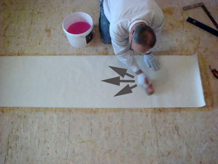 Przygotowany pasek tapety należy wałkiem albo szczotką równomiernie nasmarować klejem. Smarować należy od środka w kierunku brzegów, by na tapecie nie pozostały rozmazane warstwy kleju.