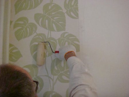 Dociskanie tapety do ściany wałkiem jednocześnie równomierne rozprowadzanie warstwę kleju.