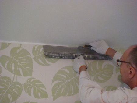 Odcinanie pasma tapety nożykiem, tak by od tapety do sufitu został 1,5 cm odstęp.