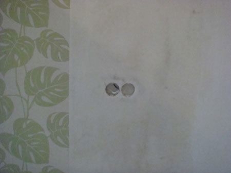 Zaklejone tapetami puszki na gniazdka od razu zaznaczamy w tapecie dziurką, którą można zrobić i palcem (wiadomo, jeżeli prąd jest odłączony albo kontakty są odizolowane), po to, by później z łatwością znaleźć te miejsca, dokładnie powycinać otwory i zamontować gniazdka.