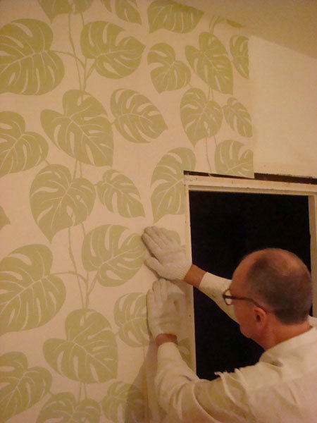 Klejenie tapet wokół drzwi.