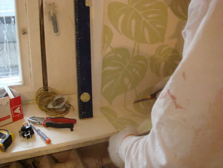 Po wyciągnięciu kabla do kinkietu, ponownie dociskamy tapetę by lepiej się przykleiła do ściany.