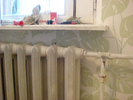 Ze względu na to, że nie ma możliwości zdemontowania rur i kaloryferów trzeba tapety kleić za nimi. Nasiąkniętą tapetę wkładamy za kaloryfer od góry i jak znajdzie się w odpowiednim miejscu delikatnie dociskamy ją do ściany.
