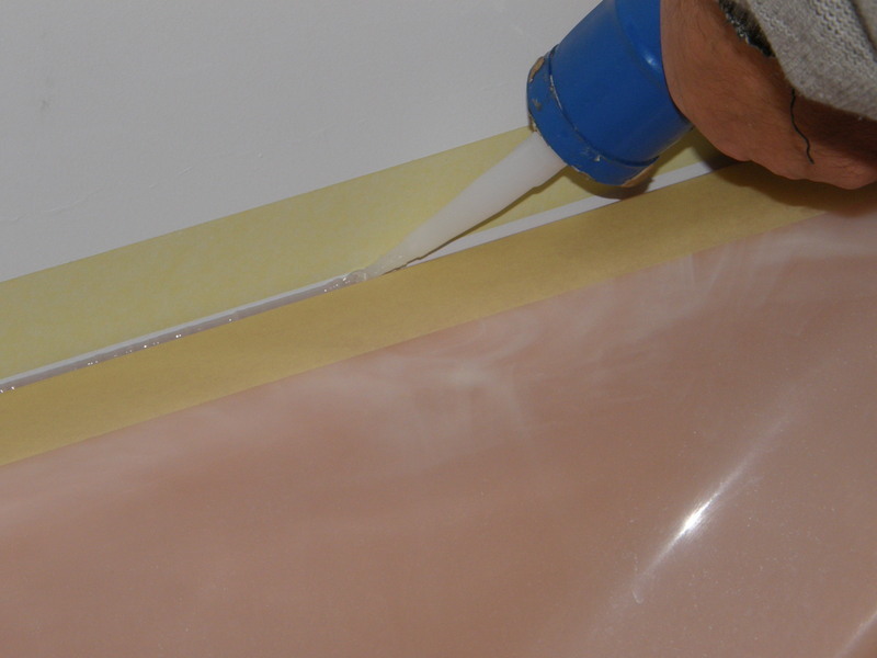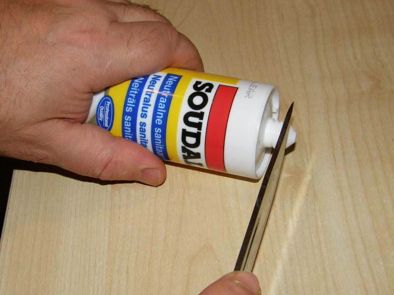 Silikon nakłada się po 15-30 minutach. W czasie wysychania spoin, przygotować należy tubkę z silikonem: nie uszkadzając gwintu odcina się końcówkę i przykręca „strzykawkę" Odcinać końcówkę należy pod kontem 45 stopni w miejscu, w którym średnica będzie taka sama albo o 1-2 mm większa niż szerokość spoiny. Przygotowaną tubkę silikonu wkłada się do specjalnego pistoletu.