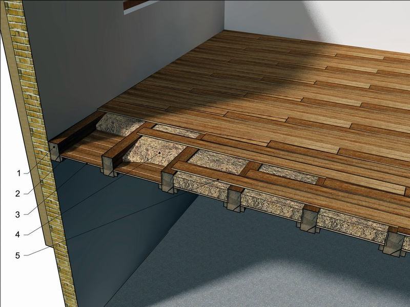 Najpierw przyjrzyjmy się oryginalnej konstrukcji podłogi z desek na drewnianym stropie. W wersji najprostszej składałaby się ona wyłącznie z elementów oznaczonych jako 1 i 5 - czyli desek przybitych od góry do belek konstrukcyjnych. Tu przedstawiono wariant nieco bardziej skomplikowany, ze ślepym pułapem i polepą zapewniającą lepszą izolację termiczną i akustyczną. Jest to oczywiście rozwiązanie bardzo ciężkie i warto je zmienić, ale o tym w jednym z kolejnych odcinków cyklu.