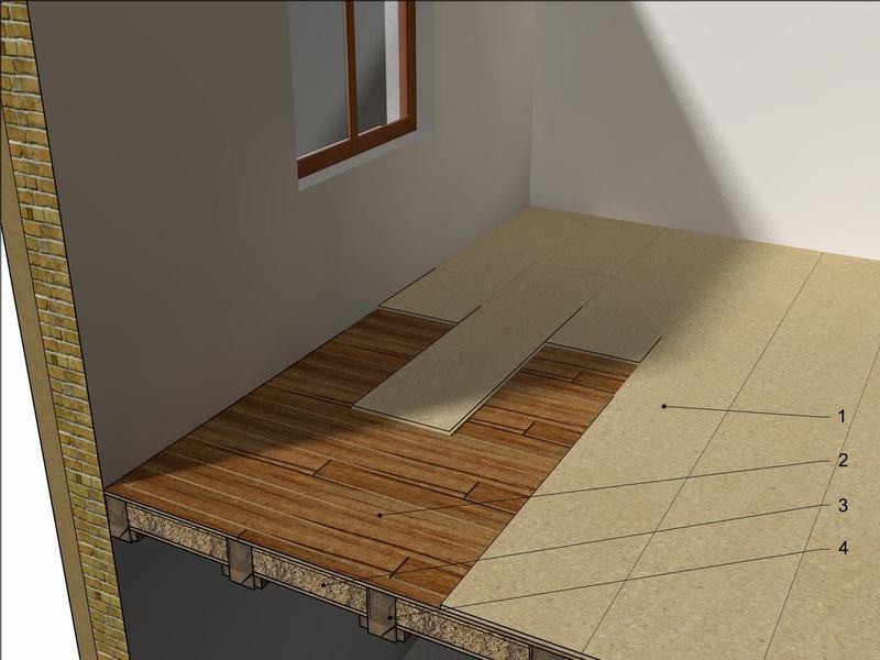 Aby zdecydowanie poprawić parametry takiej podłogi najlepiej położyć na niej dodatkową warstwę łączonych na pióro - wpust płyt MFP. Płyty układamy prostopadle do kierunku desek podłogowych i przykręcamy wzdłuż dłuższych krawędzi. Należy przy tym pamiętać o wytycznych producenta - używać gwoździ lub wkrętów o długości przekraczającej 2,5x grubość użytej płyty. Odległości między gwoździami nie mogą przekraczać 15cm. Minimalna odległość gwoździa od krawędzi płyty nie może być mniejsza niż 1cm a od narożnika 2,5cm.