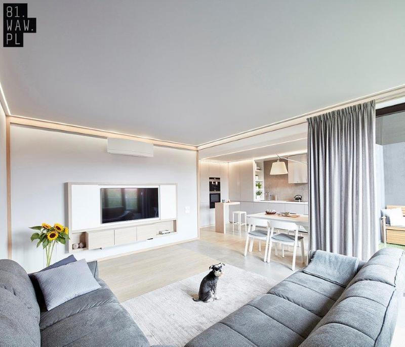 Dla właścicieli mieszkania ważne było, aby przestrzeń tworzyła harmonijną pod względem kolorów i faktur całość. Chcieli uzyskać dużą, rodzinną przestrzeń, w której będą mogli wspólnie spędzać czas i odpoczywać. Kluczem całego mieszkania są drewniane ramy, które wyznaczają kolejne pomieszczenia i elementy. Całe wnętrze jest utrzymane w jasnych kolorach oraz nie posiada wielu dodatków, dzięki czemu ramy tak dobrze w nim wyglądają, skrywając w sobie ciepłe LED-owe oświetlenie, wpływające na tworzenie domowej atmosfery.