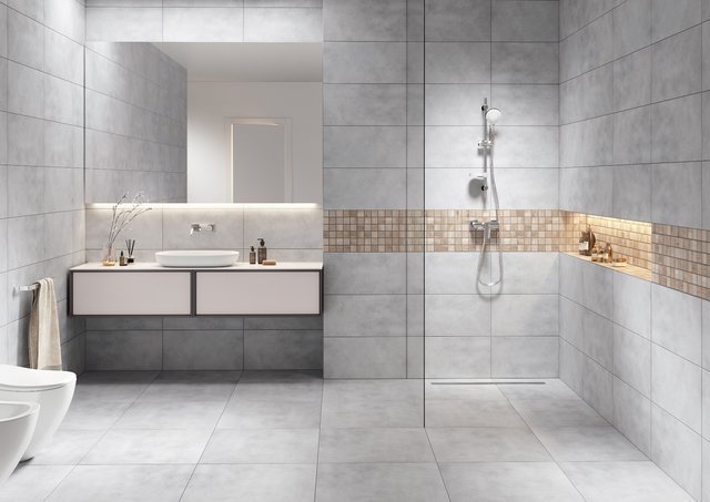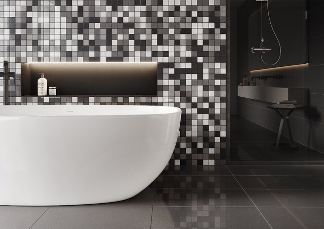 Mozaika w łazience to już niemal klasyka. Zdobi zarówno ściany, jak i podłogi, pomagając wydzielić poszczególne strefy. Świetnie sprawdzi się użyta zarówno w całym pomieszczeniu, jak i na wybranym fragmencie ściany, towarzysząc kontrastowym wielkoformatowym płytkom. Projektując salon kąpielowy oparty na mozaice, warto sięgnąć po zróżnicowaną paletę kolorów. Monochromatyczne białe wnętrze z pewnością ożywi ścienny dekor w kilku odcieniach szarości z kolekcji Cambia mix w wykończeniu lappato firmy Cerrad. Tę samą płytkę możemy także wykorzystać na większej płaszczyźnie, jako wytworne, pełne elegancji tło dla wolnostojącej wanny w nowoczesnym designie.
