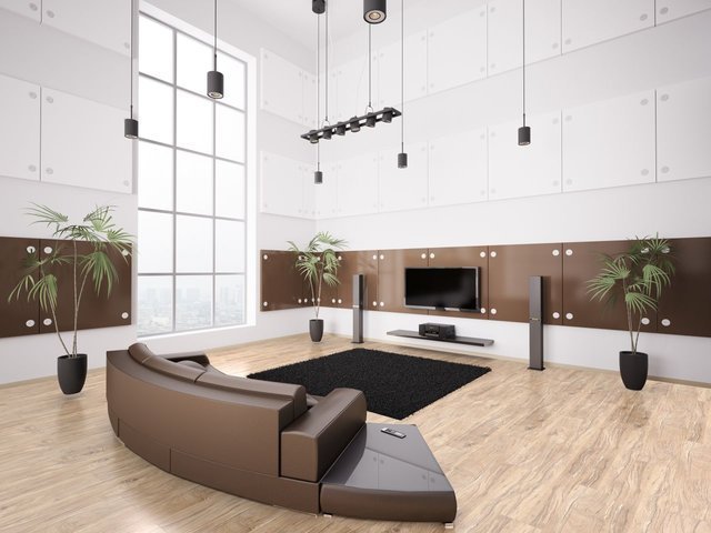 Pomieszczenia wyposażone są w sposób możliwie najbardziej oszczędny, a główny nacisk kładzie się na zachowanie otwartej przestrzeni. Reprezentatywną część salonu stanowi sofa oraz sprzęt RTV.