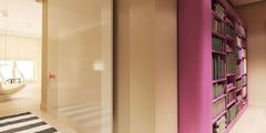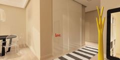 Wygodne mieszkanie dla rodziny z dwójką dzieci mieści się w nowym osiedlu przy ulicy Rydygiera na Żoliborzu. Inwestorzy cenią sobie nowoczesność, ale wnętrze o którym marzyli musiało wykraczać poza sztywność prostych form i stonowanych kolorów. Chodziło o wnętrze w którym będzie się dobrze czuła cała rodzina - zmęczeni pracą dorośli a także małe dzieci. Powstało mieszkanie w harmonijnych, szlachetnych odcieniach beży - jasne, przestronne, harmonijne. Żeby nie było zbyt nudno, doprawiliśmy je szczyptą nasyconych barw - był to strzał w dziesiątkę! Już od progu wita nas przekorny napis LOVE na suwanych drzwiach, które prowadzą do garderoby i sypialni rodziców. Obok mile poprawia nastrój słoneczna żółć dizajnerskiego wieszaka. Za zakrętem korytarza czeka nas kolejny zastrzyk optymizmu - fioletowy regał na pokaźną bibliotekę państwa domu. Przy tych szalonych kolorach salon stanowi oazę odprężenia - tu kolory delikatnie wprowadzą przedmioty osobiste rozmieszczone na regale-parawanie, który przysłania kuchnię. Całość jest naturalna i prosta, a za razem niebanalna.