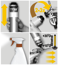 Osadzanie drzwi i ram okiennych wykonywać bezwzględnie przy użyciu łączników mechanicznych. Przed aplikacją powierzchnię wyczyścić, odtłuścić i zwilżyć wodą. Wstrząsnąć puszką kilkakrotnie i nakręcić pianę na adapter pistoletu. Podczas aplikacji trzymać puszkę w pozycji odwróconej; wypełnić szczelinę w około 50%. Czas obróbki: ok. 30 min. Utwardzoną pianę zabezpieczyć przed promieniowaniem UV za pomocą uszczelniacza, tynku lub farby (nie wcześniej niż 24 h po aplikacji).