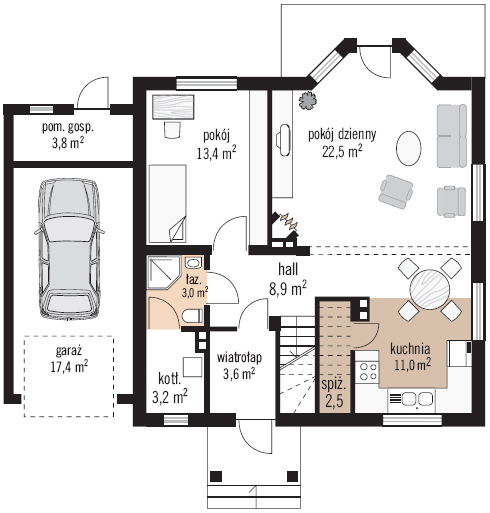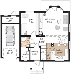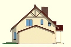 Wzbogacona wersja domu „Omega I". Ten niewielki dom mieści w sobie wszystkie niezbędne pomieszczenia, dające pełen komfort mieszkania dla 4-, 5-osobowej rodziny. Spiżarnia przy kuchni, wydzielona kotłownia z możliwością przestawienia drzwi do wiatrołapu lub garażu oraz pomieszczenie za garażem dodatkowo podnoszą funkcjonalność tego domu. „Omega II" z racji swego kształtu (rzut na planie kwadratu, zwarta bryła bez załamań, dwie kondygnacje) jest domem energooszczędnym.