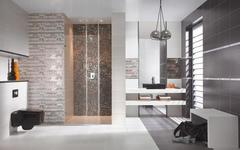 Chłodna i ascetyczna biel w połączeniu z kontrastowymi, grafitowymi płytkami bazowymi uzupełnione są o dekoracje 3D z lśniącym, platynowym motywem. Surowa elegancja refleksującego motywu, połączona z listwami szklanymi w srebrnym lub grafitowym odcieniu pozwala na stworzenie nowoczesnego, jasnego wnętrza o zdecydowanym charakterze.