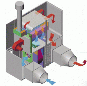 Wymiennik ciepła żaroodporny z aluminizowanej blachy stalowej, z całkowitym zawrotem płomienia, w górnej części wymiennika w spłaszczonych przewodach spalinowych turbulatory ze stali inox, przeciwwybuchowy kołnierz z oszklonym wziernikiem płomienia, wentylator odśrodkowy wyposażony w regulowaną żaluzję wylotu powietrza i zabezpieczony siatką powietrza od strony wlotu oraz wyposażony w aluminiowy kołnierz przeciw zaiskrzeniu, silnik elektryczny wentylatora trójfazowy (400V) w wykonaniu kołnierzowym, obudowa panelowa wyizolowana wełną mineralną.